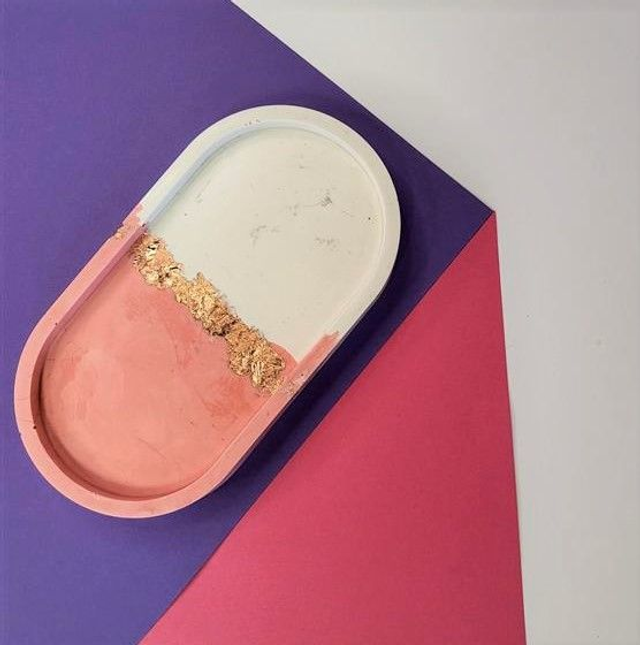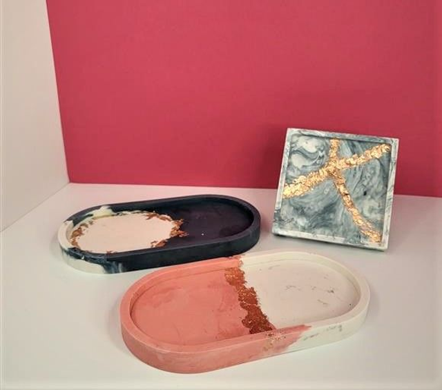 These trays make a lovely gift, or beautiful decorative item for your home. Use them to display your jewellery, a candle or your small trinkets. Hand made by our students using an environmentally friendly material called Jesmonite, which is a great alternative to resin as its solvent free, non-toxic and has no VOC’s.