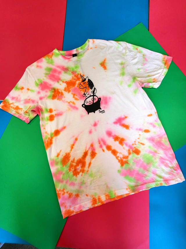 Each T-shirt is lovingly tie-dyed and hand printed by one of our students. The Unisex fit gives them a relaxed look and they come in sizes ranging from small to 2 XL.